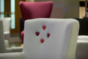 bouquet di cuori (un inserto di quattro cuori distribuiti sugli angoli di un rombo immaginario) sullo schienale delle sedie dai colori più chiari, unificando così l’intero gruppo con eleganza e raffinatezza. Il tutto è ovviamente disposto su morbida moquette beige ed accompagnato da legno, e scale di marroni, grigi, gialli, lime e naturalmente rossi su poltrone e divani massicci e geometrici.